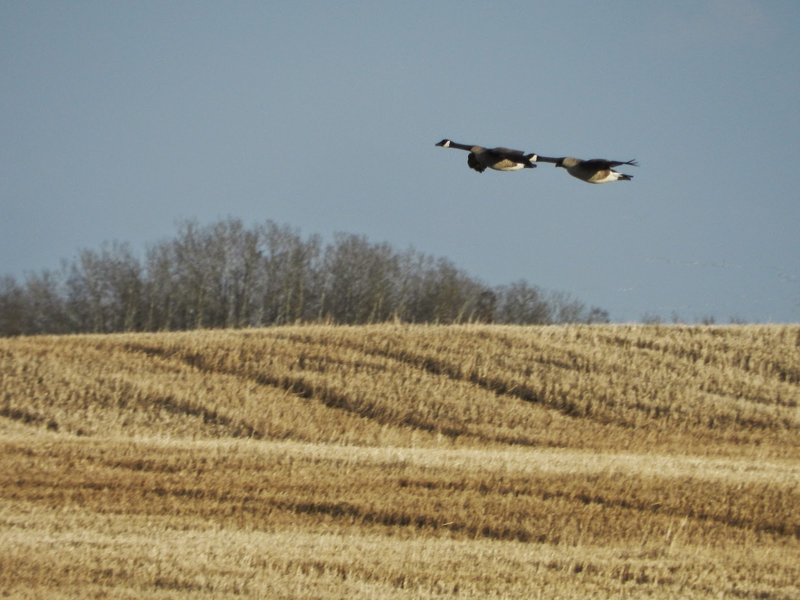 | Canada Geese Pair in Flight, South of Montmartre, SK, April 8, 2015 |